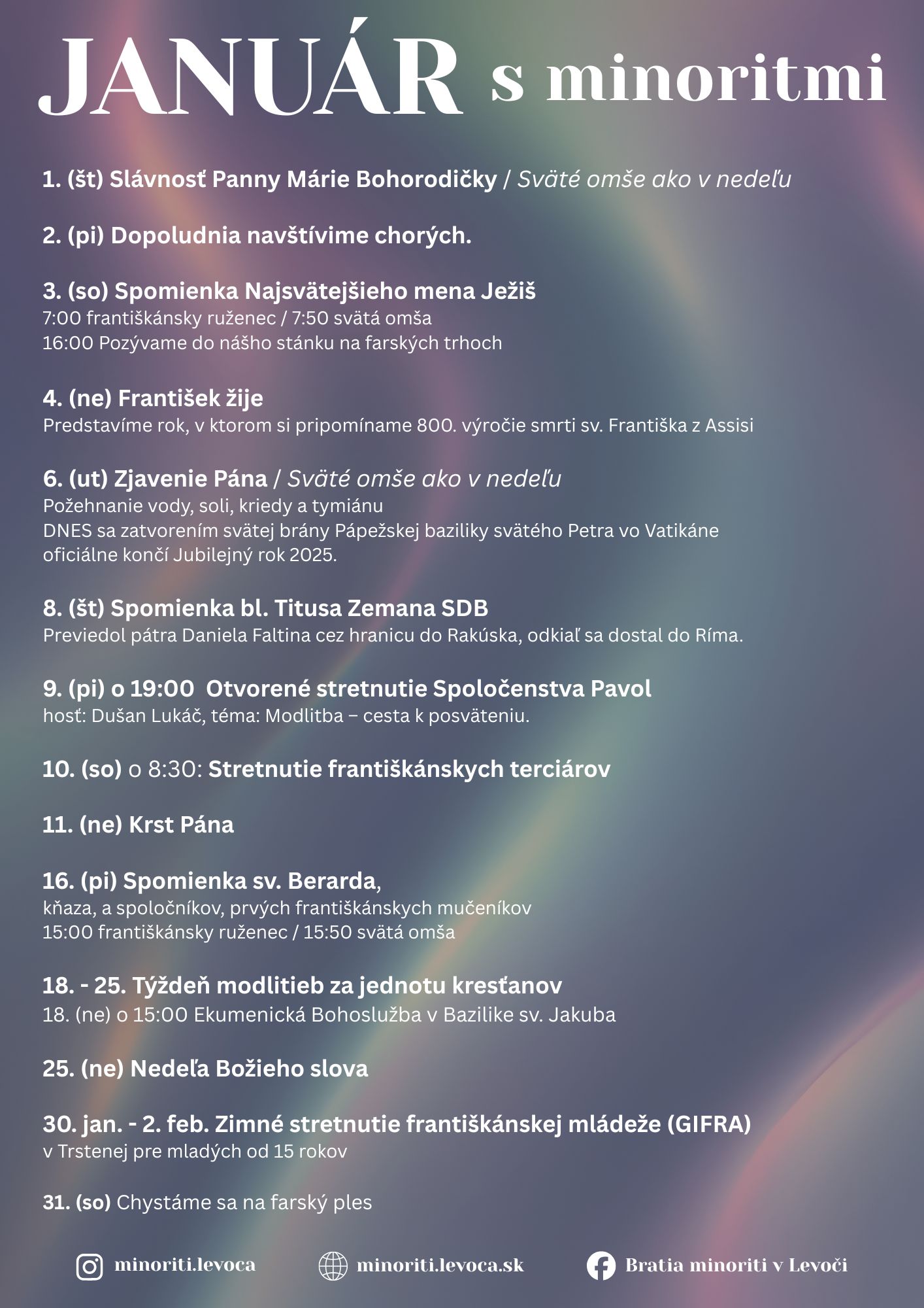 - Dávame do pozornosti podcast Biblia za rok, ktorý nás počas roku 2026 prevedie celým Svätým písmom (365 epizód v trvaní 20-25 minút). Okrem samotného textu Písma obsahuje každá epizóda aj komentár, zamyslenie a modlitbu. Podcast nájdete na Spotify, Apple podcasts a YouTube. Každý deň o 12:30 si ho môžete vypočuť aj na Rádiu Lumen.
